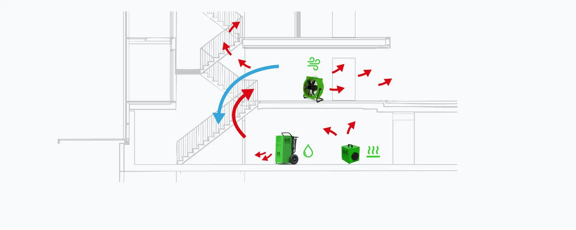 Onze ventilatoren zorgen voor een efficiënte verspreiding van warme lucht en versnellen het droogproces bij bouwdroging. Dankzij een gelijkmatige luchtcirculatie worden koude zones vermeden en drogen wanden en vloeren sneller en consistenter. Ideaal voor een vlotter en effectiever werfverloop.