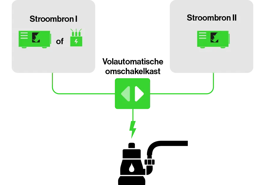 Bij toepassingen waar stroomvoorziening absoluut onmisbaar is – zoals bij waterpompen of andere kritische processen – bieden onze volautomatische omschakelkasten een betrouwbare oplossing. Zodra de stroom uitvalt, schakelen ze onmiddellijk en volledig automatisch over op een gekoppelde stroomgenerator. Zo blijft jouw installatie ononderbroken functioneren, zonder handmatige tussenkomst.