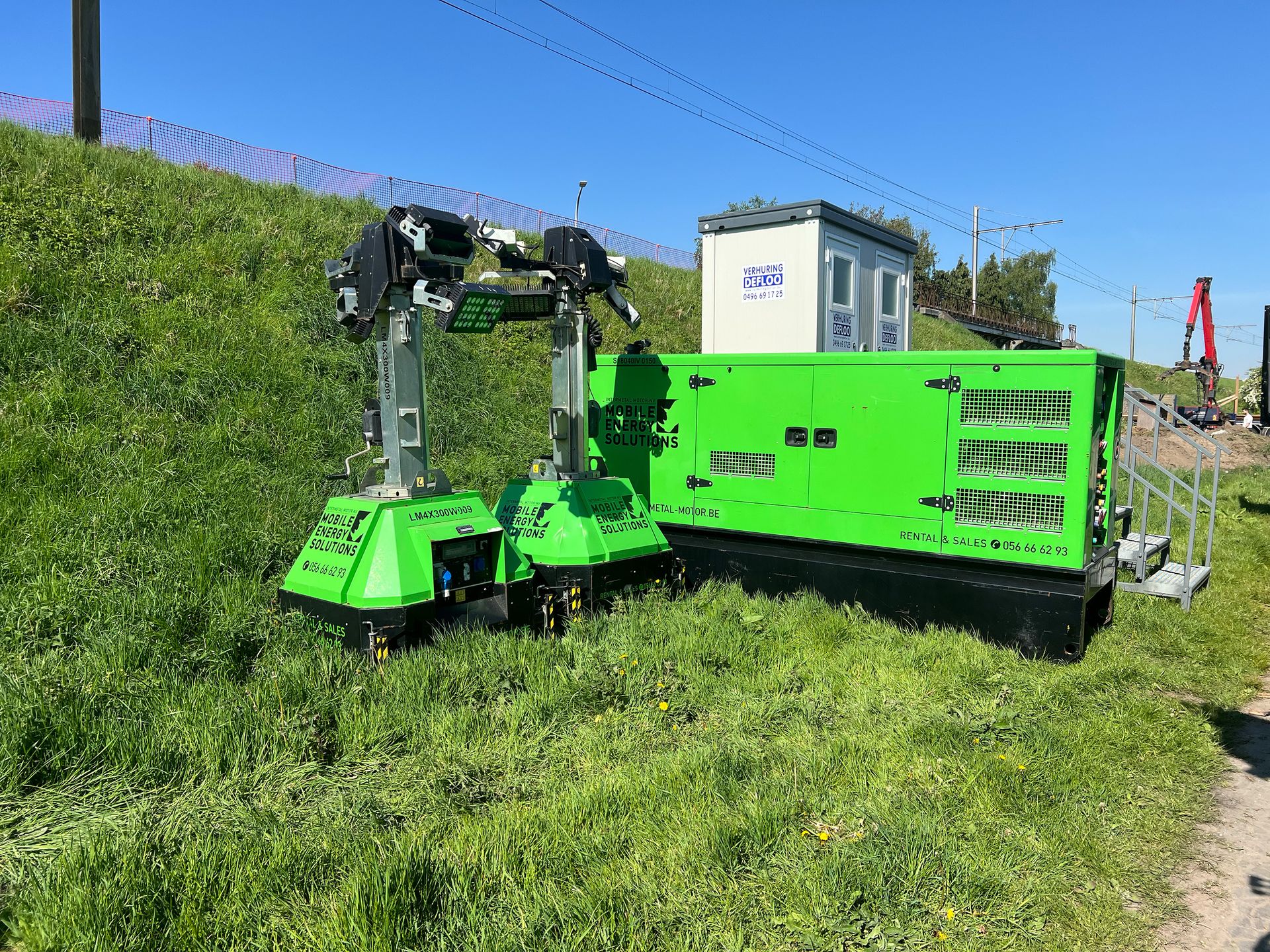 Naast de lichtmasten leverden we ook twee stroomgroepen van 100 kVA, die een betrouwbare energievoorziening garandeerden voor de verlichting en de overige werfinstallaties.