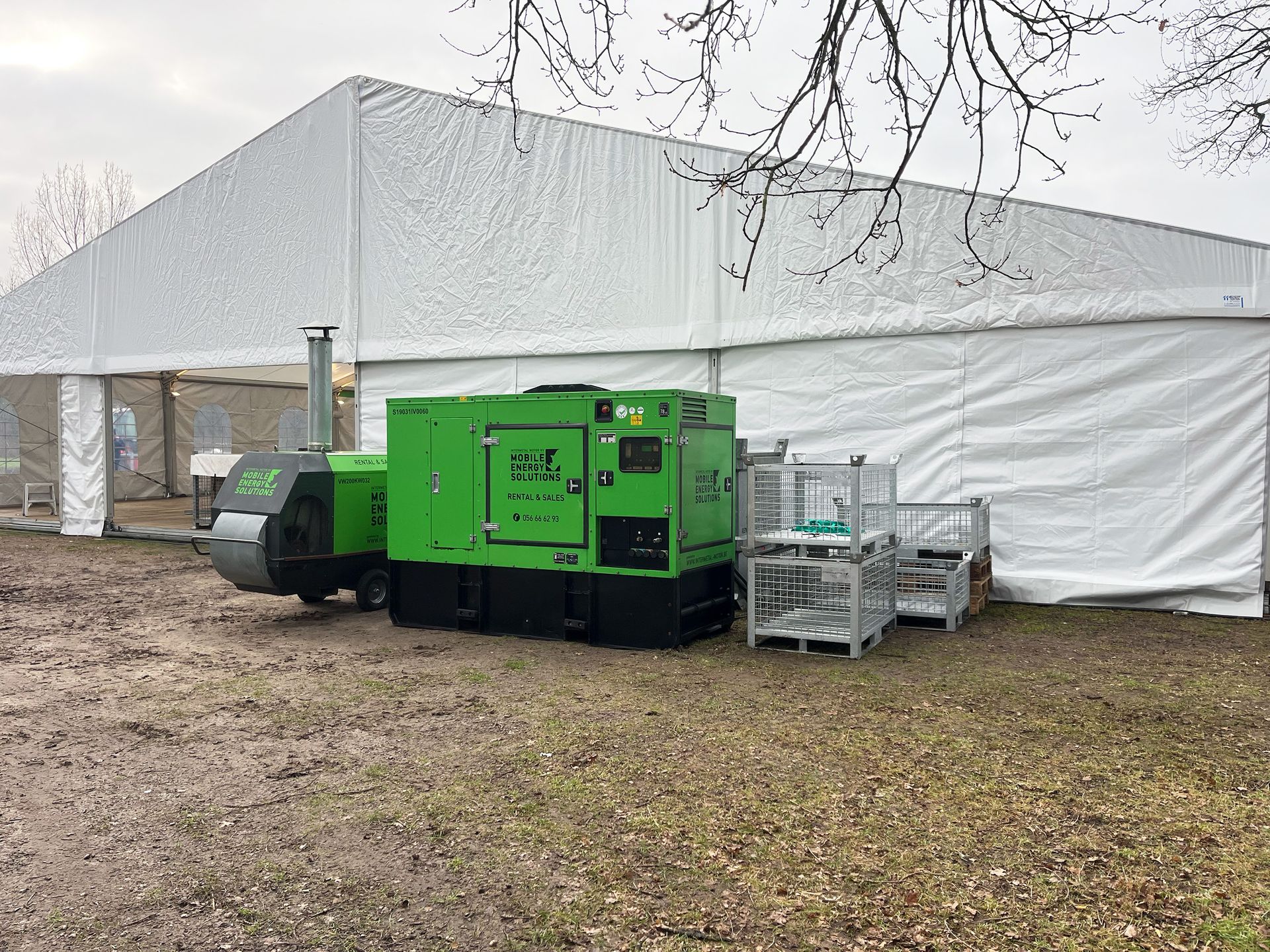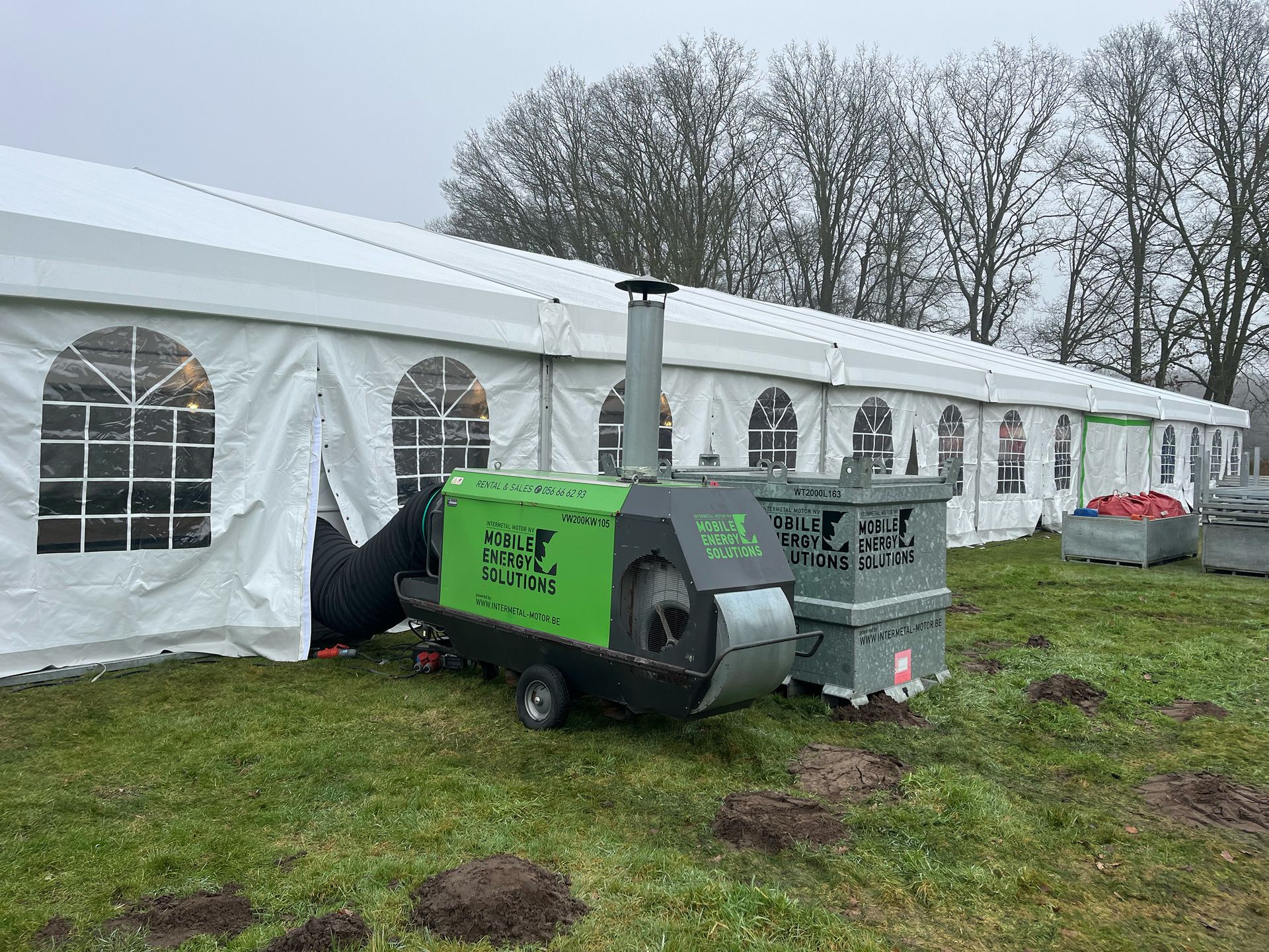 We plaatsten drie mobiele verwarmingen van 200 kW, aangedreven door een 60 kVA-stroomgroep. Deze combinatie leverde voldoende vermogen om de grote tent snel op temperatuur te brengen én de warmte gelijkmatig te verdelen — een cruciaal element voor het succes van elk evenement, zeker bij frissere buitentemperaturen.