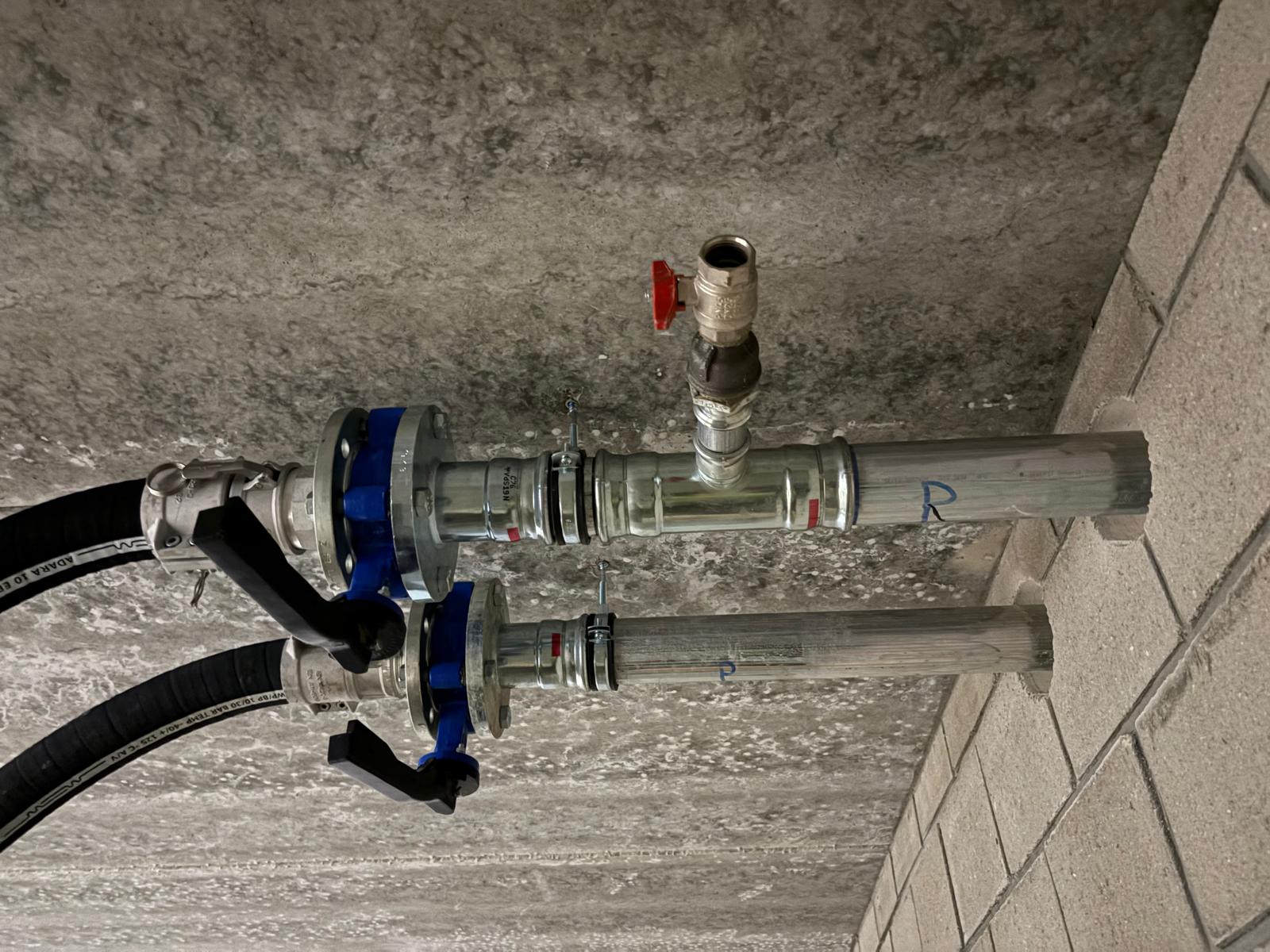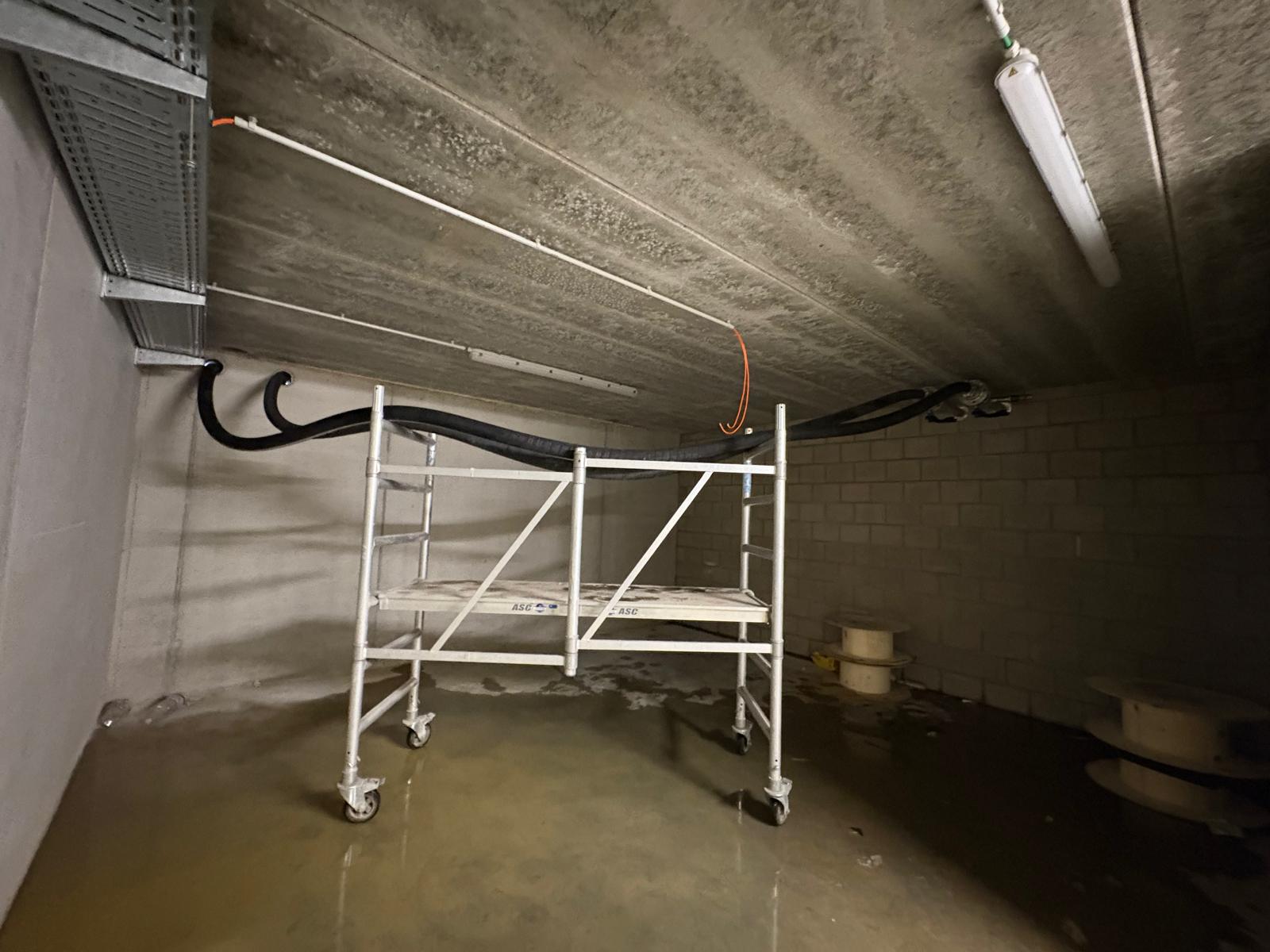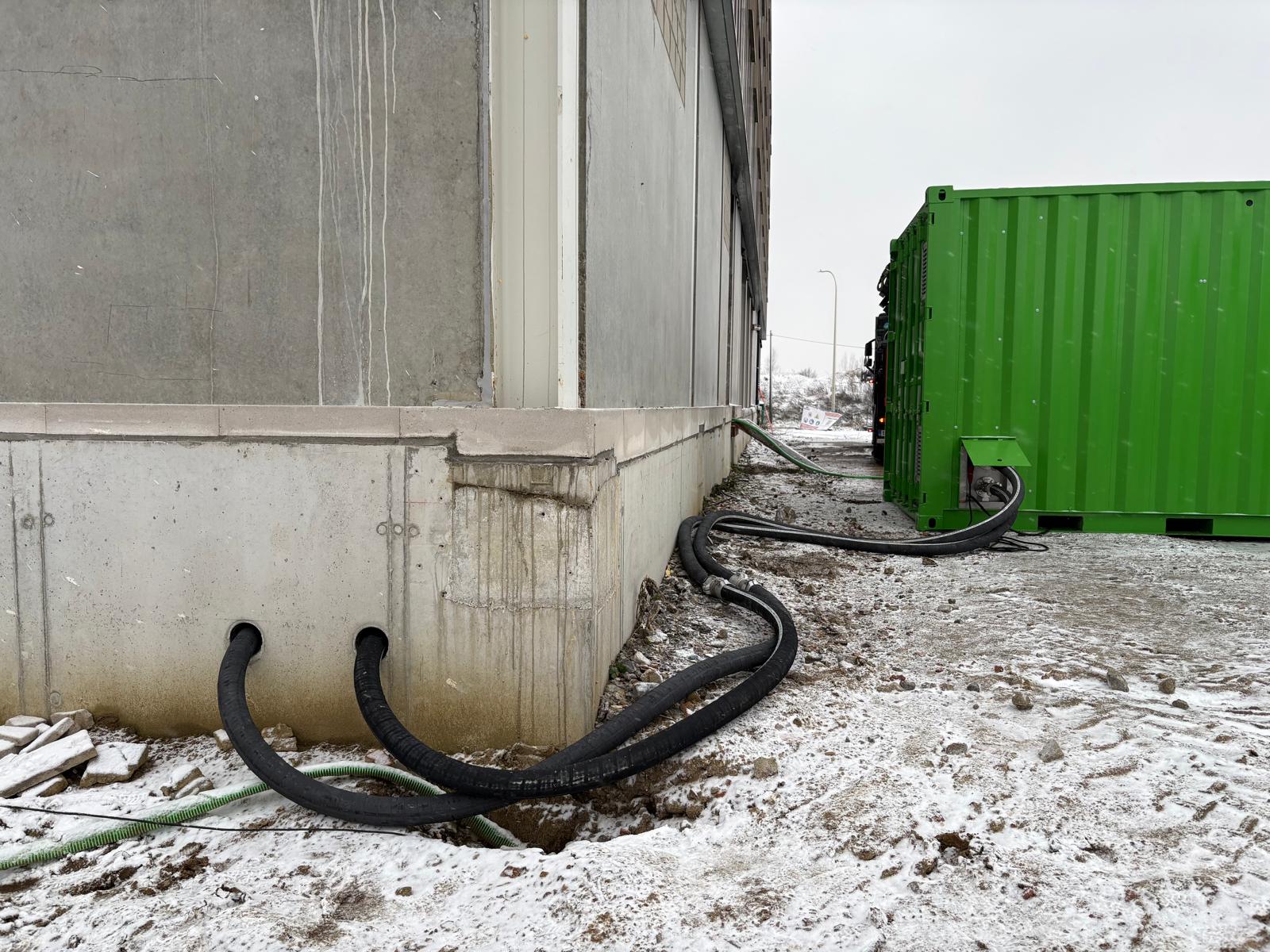 Het gebouw telt drie verdiepingen en heeft een totale oppervlakte van ongeveer 1.500 m². We sloten aan met een 100 kW mobiele boiler op de hoofdcollectoren in de kelderverdieping, waar ook de definitieve technische installatie zal worden ondergebracht. De installatie werkt op een temperatuurregime van 35°C/25°C, perfect afgestemd op de aanwezige vloerverwarming.
